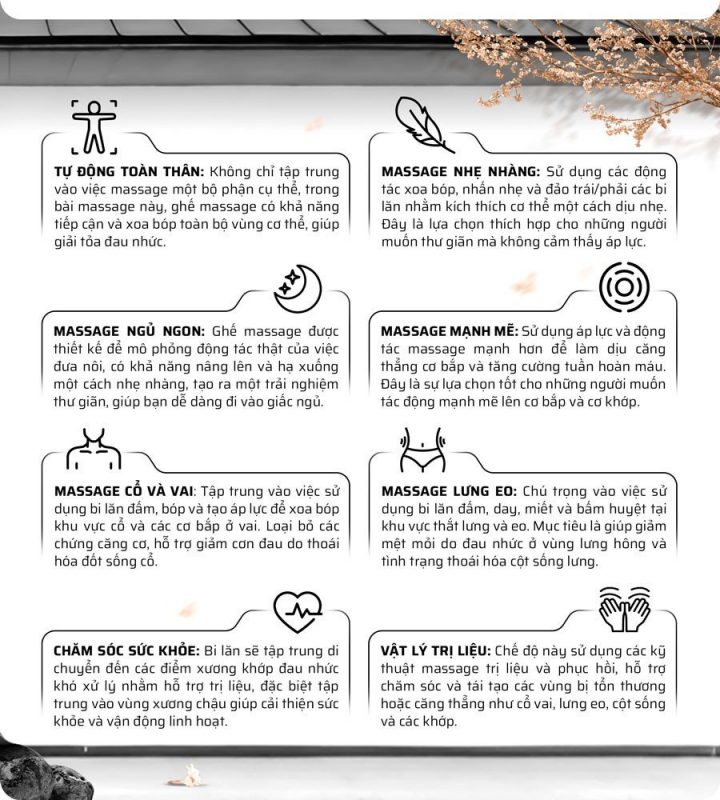 Một điểm độc đáo của chức năng massage túi khí tùy chỉnh là khả năng tùy chỉnh áp lực và vị trí của các túi khí theo mong muốn. Người sử dụng có thể điều chỉnh cường độ massage và vị trí áp dụng theo nhu cầu riêng, tạo ra một trải nghiệm massage độc đáo và phù hợp với sự thoải mái của người dùng.