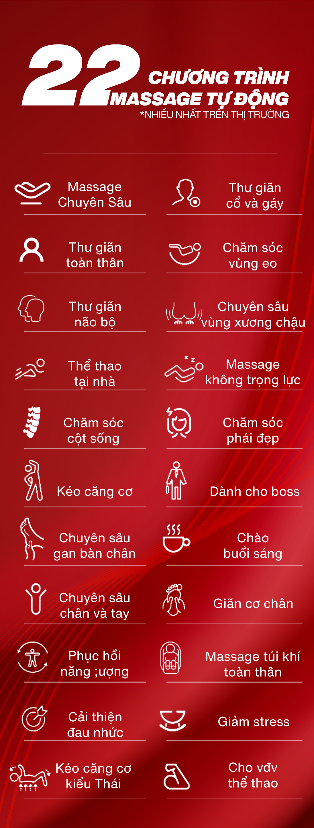 22 chương trình massage tự động.