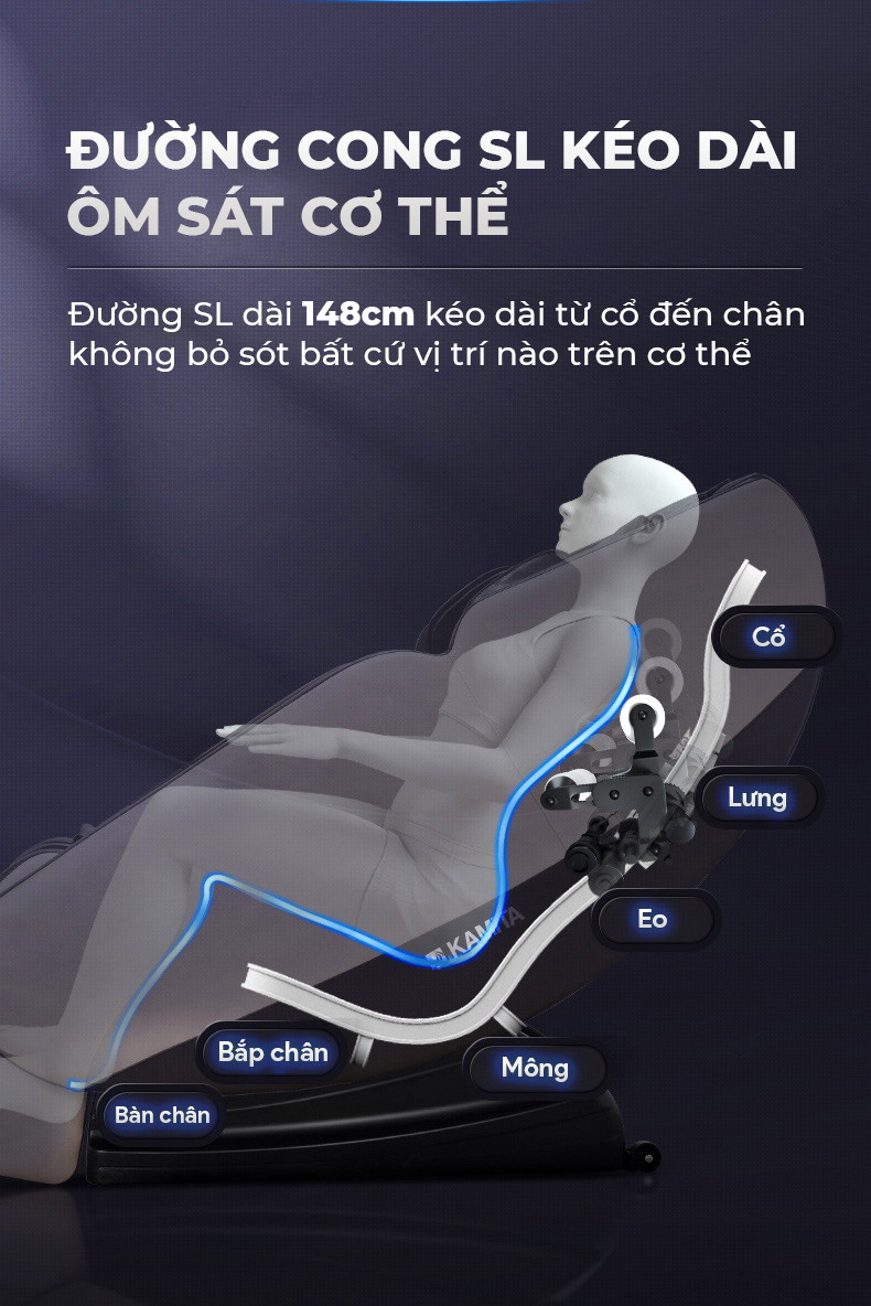 Với khung đỡ SL tiên tiến nhất hiện nay, Kamita KC-568 giúp định vị chính xác các huyệt đạo bằng cách áp sát đường cong cơ thể theo hình chữ S, đồng thời mở rộng diện tích mát xa xuống đùi dưới.