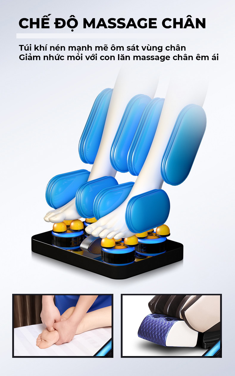 - Túi khí và con lăn vùng chân ôm sát, thực hiện massage sâu và bấm huyệt trên gan bàn chân