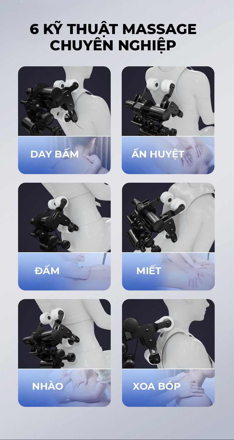 - Chế độ massage mô phỏng chính xác bàn tay con người với 6 kỹ thuật chuyên nghiệp