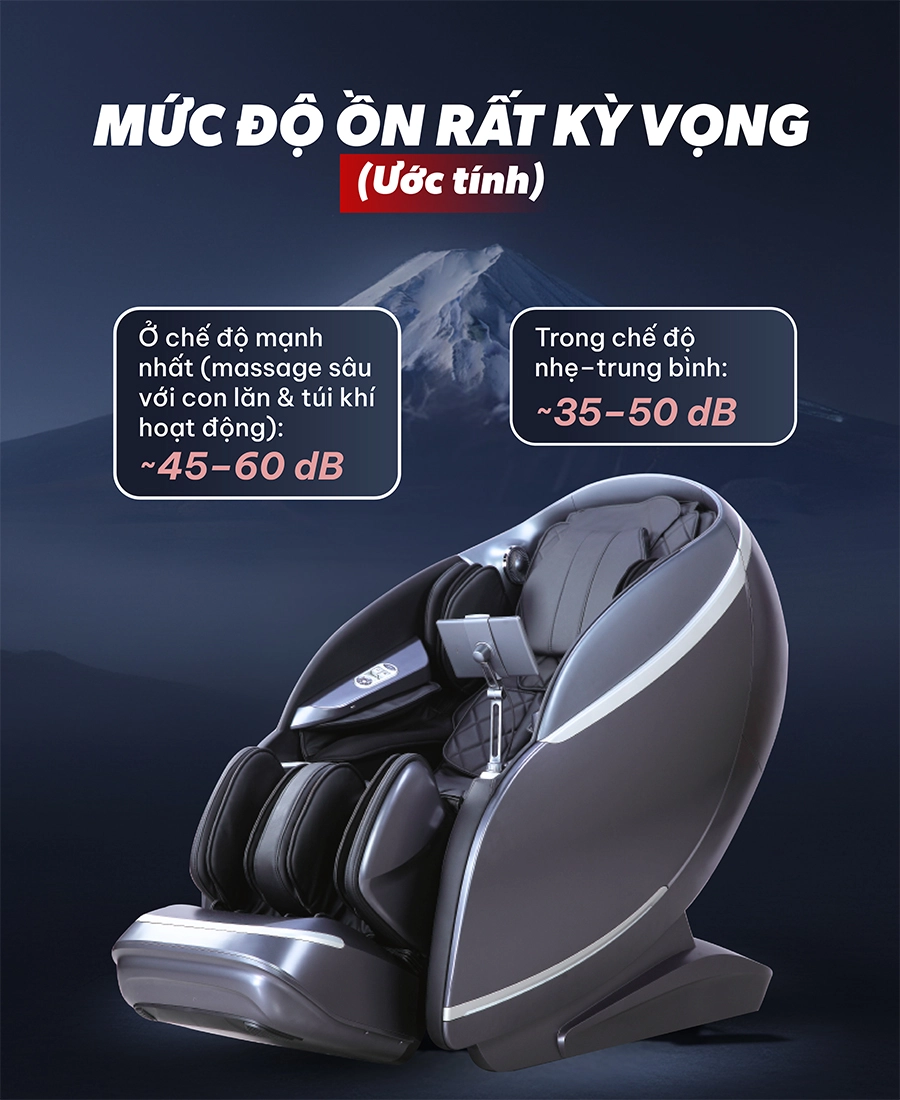 | Độ ồn khi sử dụng | Chế độ nhẹ–trung bình: 35–50 dB; Chế độ mạnh nhất (massage sâu với con lăn & túi khí hoạt động): 45–60 dB |