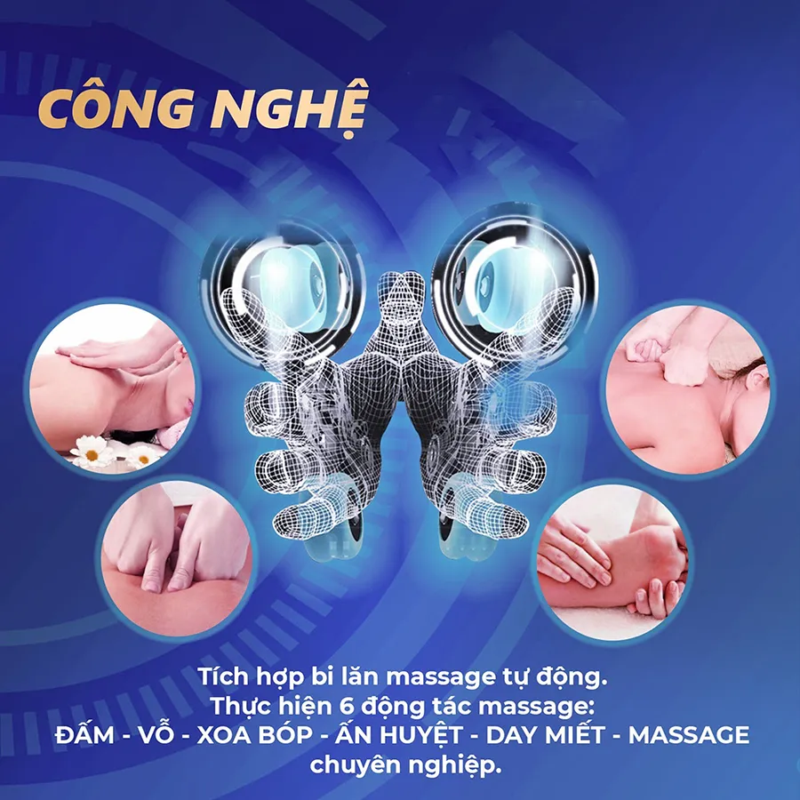 Công nghệ ion âm hiện đại tạo ion nhân tạo, giúp làm sạch không khí xung quanh, loại bỏ bụi bẩn, vi khuẩn và mùi khó chịu. Nhờ đó, người dùng được thư giãn trong không khí trong lành, nâng cao trải nghiệm massage, đồng thời tốt cho hệ hô hấp và tinh thần.