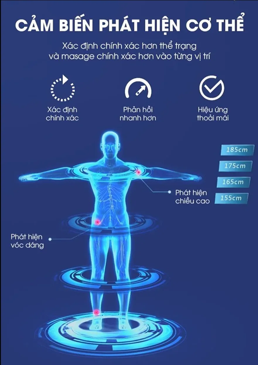 Tích hợp chip AI thế hệ mới nhất 2024, dò quét chính xác kích thước đốt sống cổ, vai và cột sống. Từ đó, hệ thống con lăn và túi khí tự động điều chỉnh vị trí, lực tác động phù hợp, đảm bảo massage đúng huyệt đạo, giúp tối ưu hiệu quả chăm sóc.