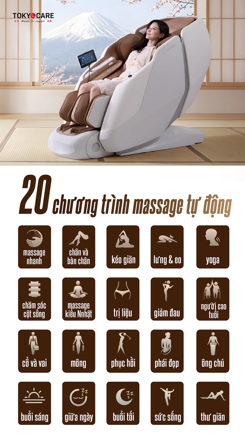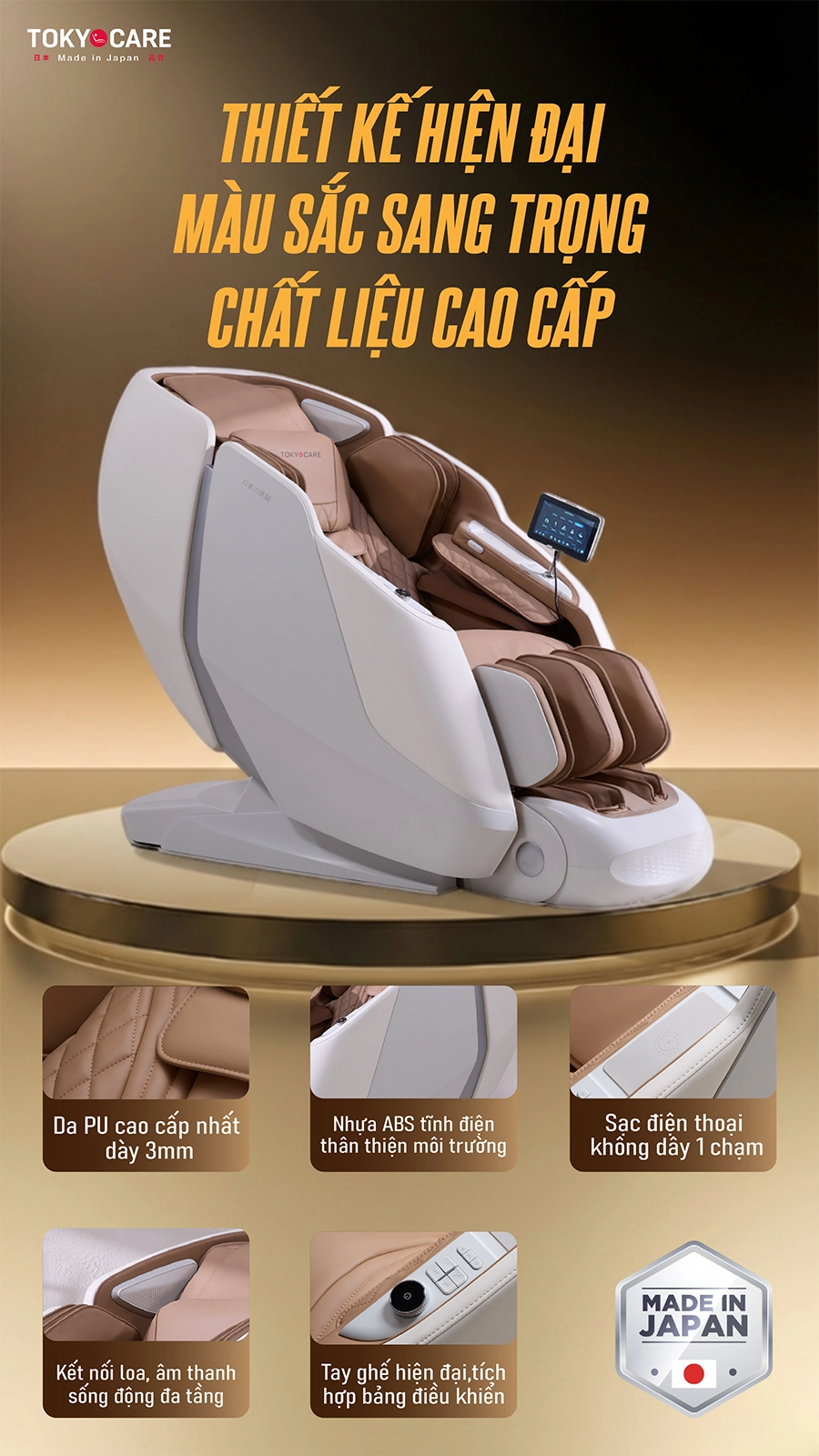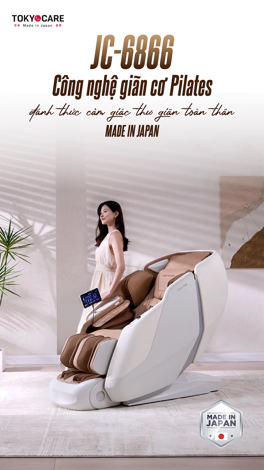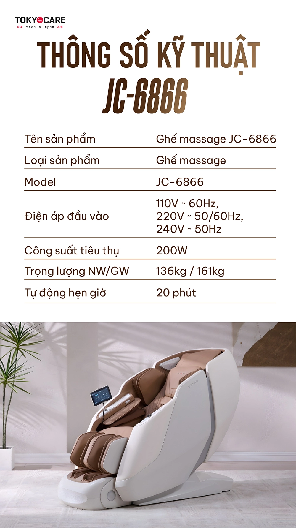 Ghế Massage JC-6866 là dòng ghế massage cao cấp Made in Japan, được sản xuất trực tiếp tại Nhật Bản và vận hành theo chuẩn điện 110V, đáp ứng đầy đủ các tiêu chuẩn nghiêm ngặt về chất lượng, độ bền và độ chính xác trong từng chuyển động massage.