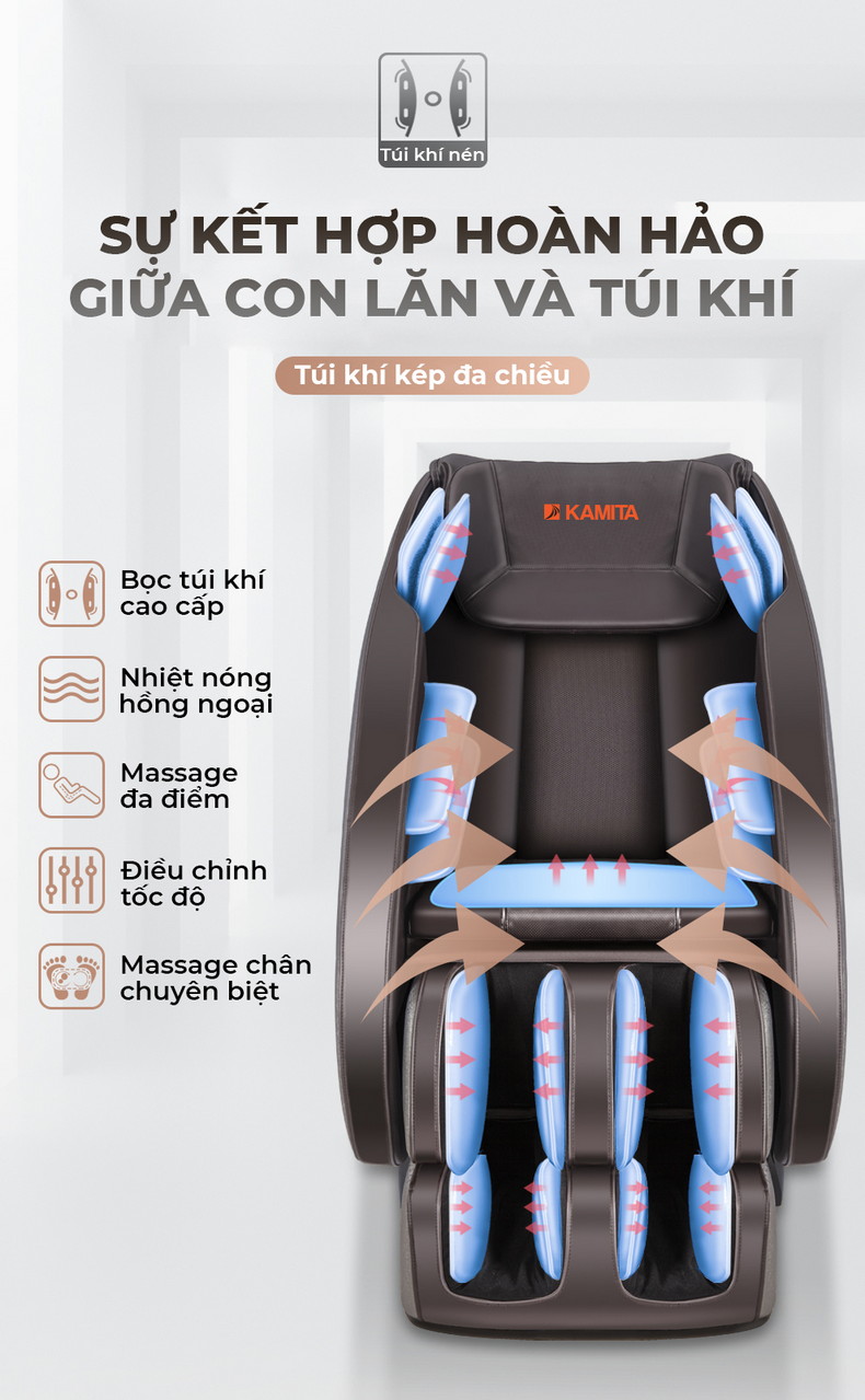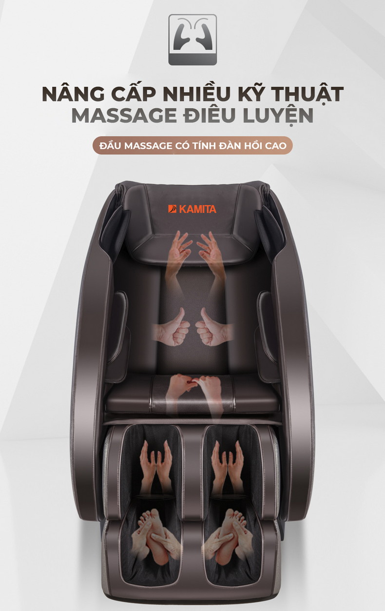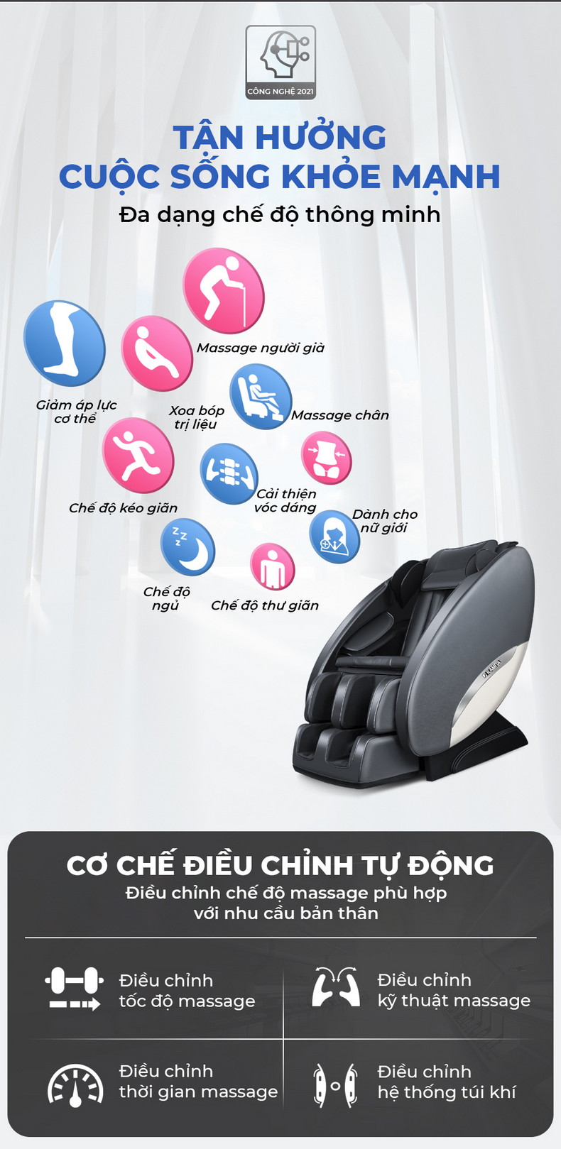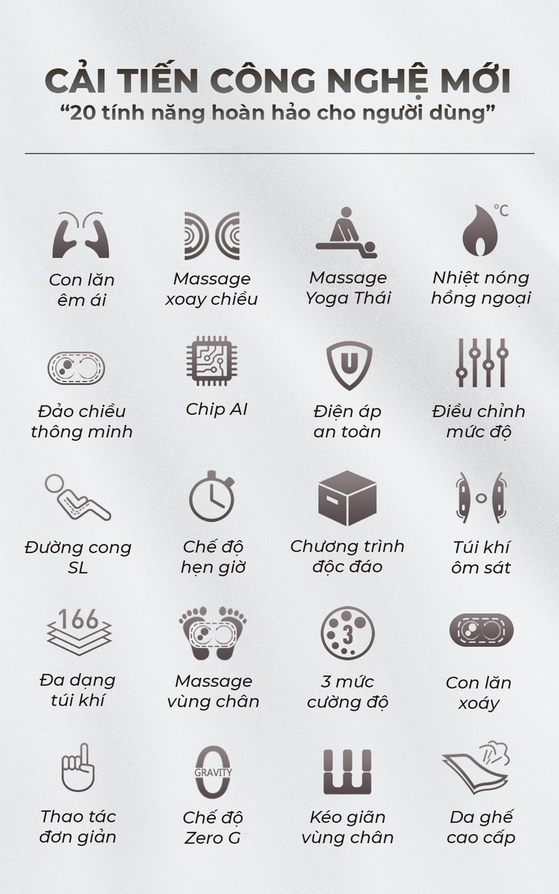 - Nâng cấp nhiều kỹ thuật massage hiện đại mô phỏng bàn tay người thật nhờ hệ thống túi khí kép đa chiều trải dài toàn thân