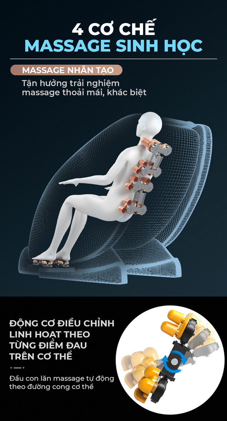 - Hệ thống con lăn dò tìm huyệt đạo tại 5 điểm cố định: cổ, vai, lưng, eo, hông.