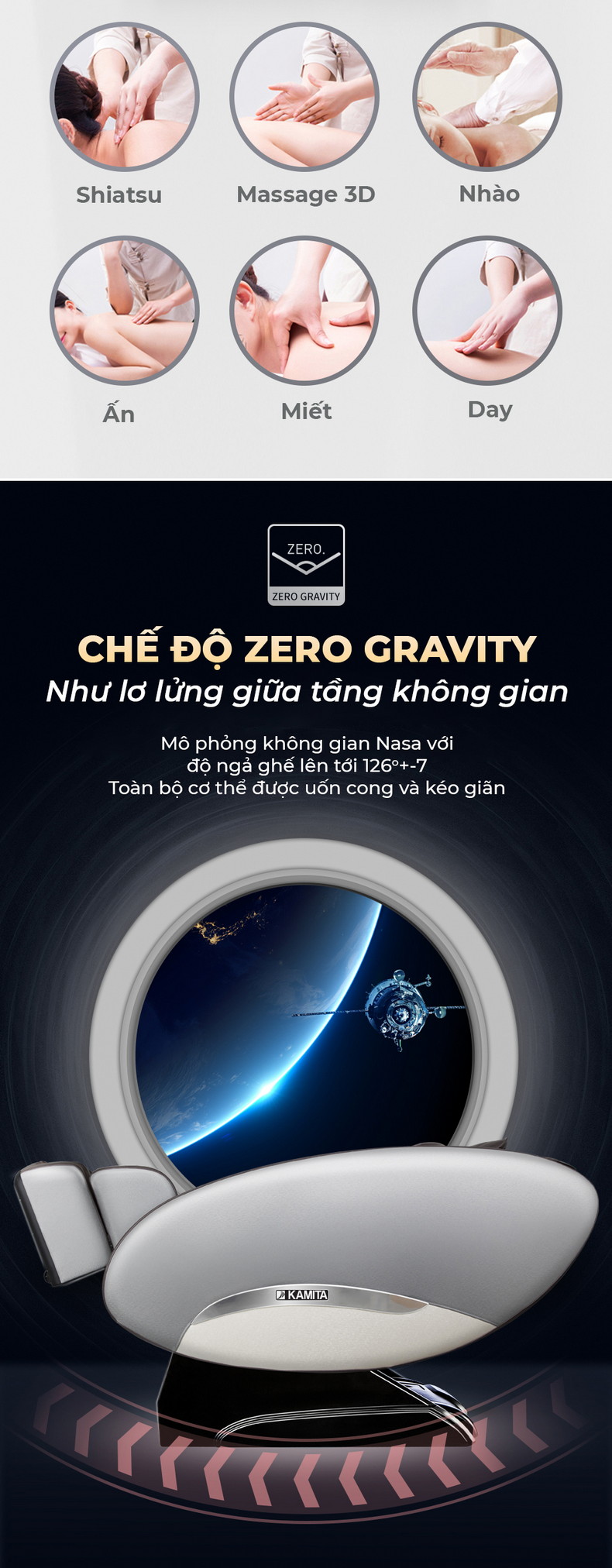 Chế độ Zero-Gravity của Kamita KC-266 được xem là bước đột phá lớn trong công nghiệp sản xuất ghế massage hiện nay. Các nhà khoa học NASA đã tìm ra được định luật giúp phi hành gia chống lại lực hút lớn bằng cách thực hiện tư thế ngả người ra sau và nâng cao chân tạo thành góc nghiêng 120 - 130 độ. Từ những phát hiện nay, các dòng ghế massage cao cấp của Kamita đã nhanh chóng trang bị thêm tính năng không trọng lực nổi tiếng. Khi thực hiện chế độ Z-Gravity, ghế massage Kamita KC-266 tạo góc nghiêng lên tới 126 +/- 7 độ, giúp các con lăn và túi khí ôm sát người để massage sâu và nâng đỡ cơ thể.
