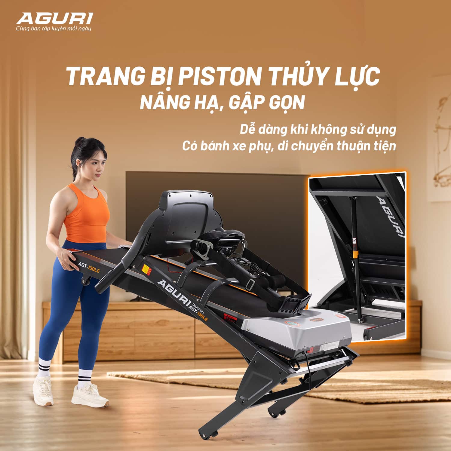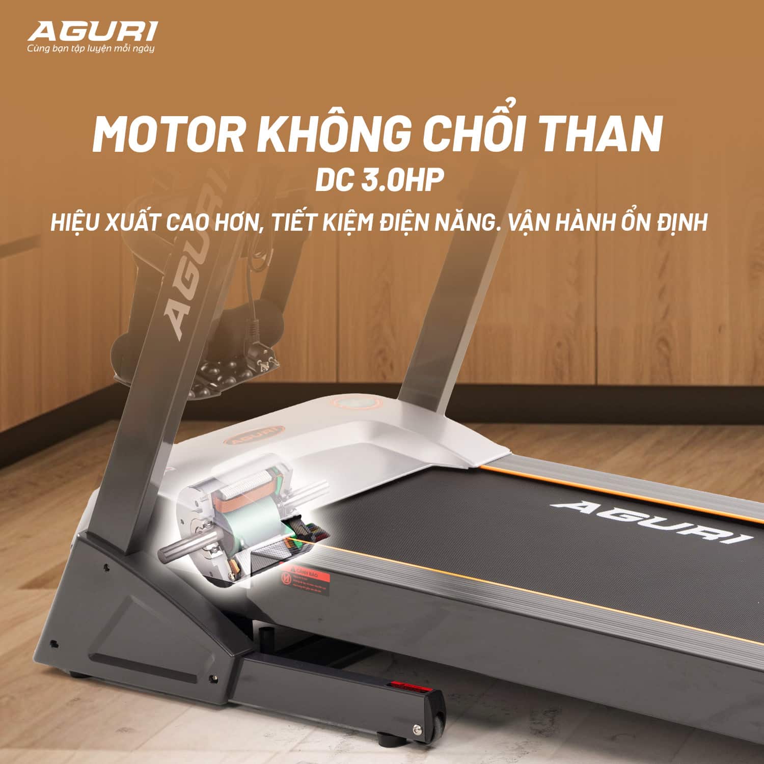 Máy chạy bộ AGT-130LE được trang bị motor AC không chổi than với công suất 3.0HP, giúp máy vận hành êm ái, bền bỉ và ổn định trong thời gian dài.
