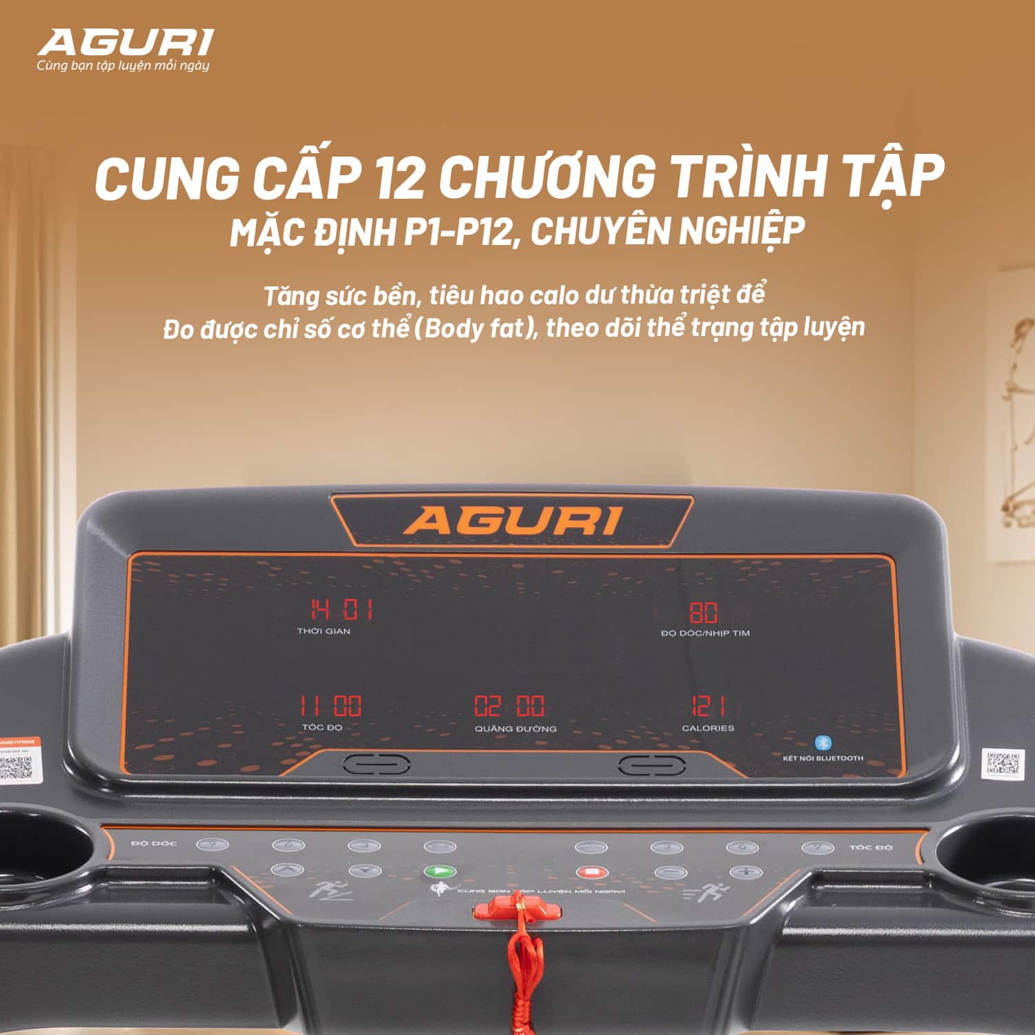 AGT-130LE là dòng máy chạy bộ đa năng, tích hợp 12 chương trình tập luyện tự động (P1–P12), giúp người dùng linh hoạt lựa chọn bài tập theo nhu cầu.