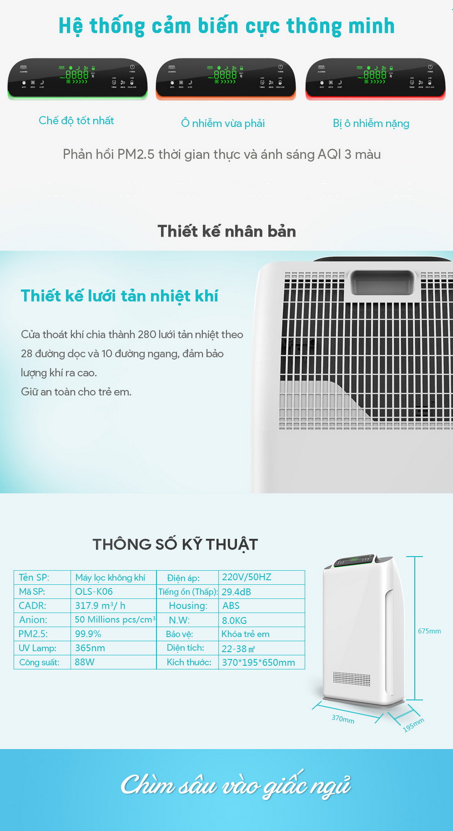 - • Thiết kế 280 lưới tản nhiệt khí đảm bảo lượng khí thoát ra cao, an toàn cho trẻ nhỏ 3 chế độ quạt gió tự động, mức độ tiếng ồn dưới 29dB không làm gián đoạn giấc ngủ