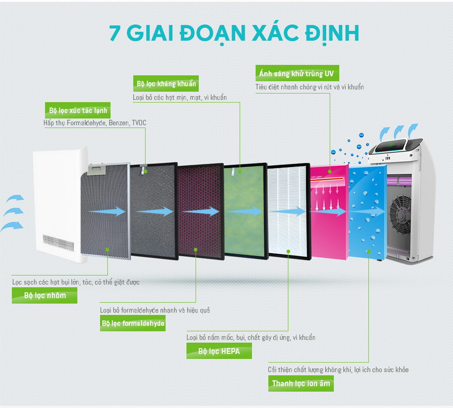 - • Bộ lọc HEPA: Loại bỏ trên 99% chất ô nhiễm có kích thước nhỏ 0.01 micron, đảm bảo không khí sạch sẽ, không còn bụi, vi khuẩn, nấm, virus hay các chất gây dị ứng.