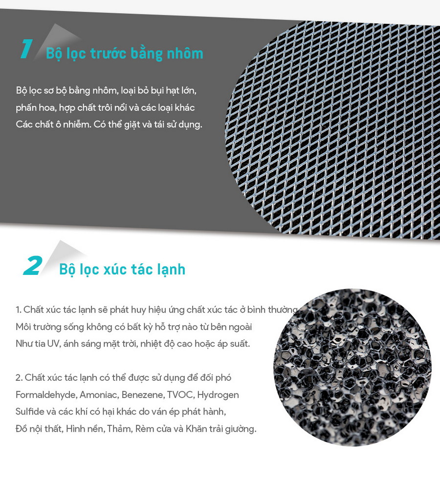 - • Bộ lọc Cold Catalyst: Dễ dàng xử lý các loại khí độc nguy hiểm như Formalin, Amoniac, Benzen, TVOC, H2S mà không cần dùng nhiệt, tia UV, áp suất.