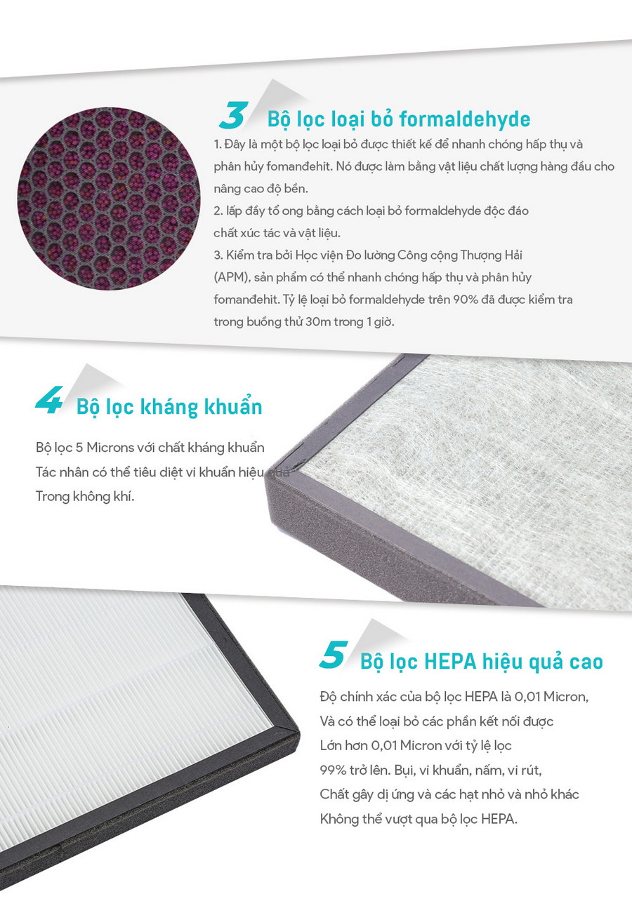 - • Bộ lọc kháng khuẩn: Các lỗ lọc đường kính 5 microns có thể tiêu diệt vi khuẩn trong không khí.