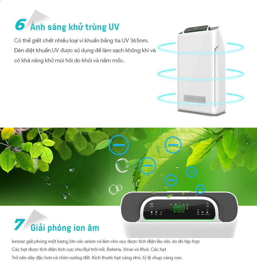 - • Ánh sáng khử trùng UV: Trực tiếp tiêu diệt vi khuẩn, khử mùi hôi do khói thuốc, thức ăn, nấm mốc.