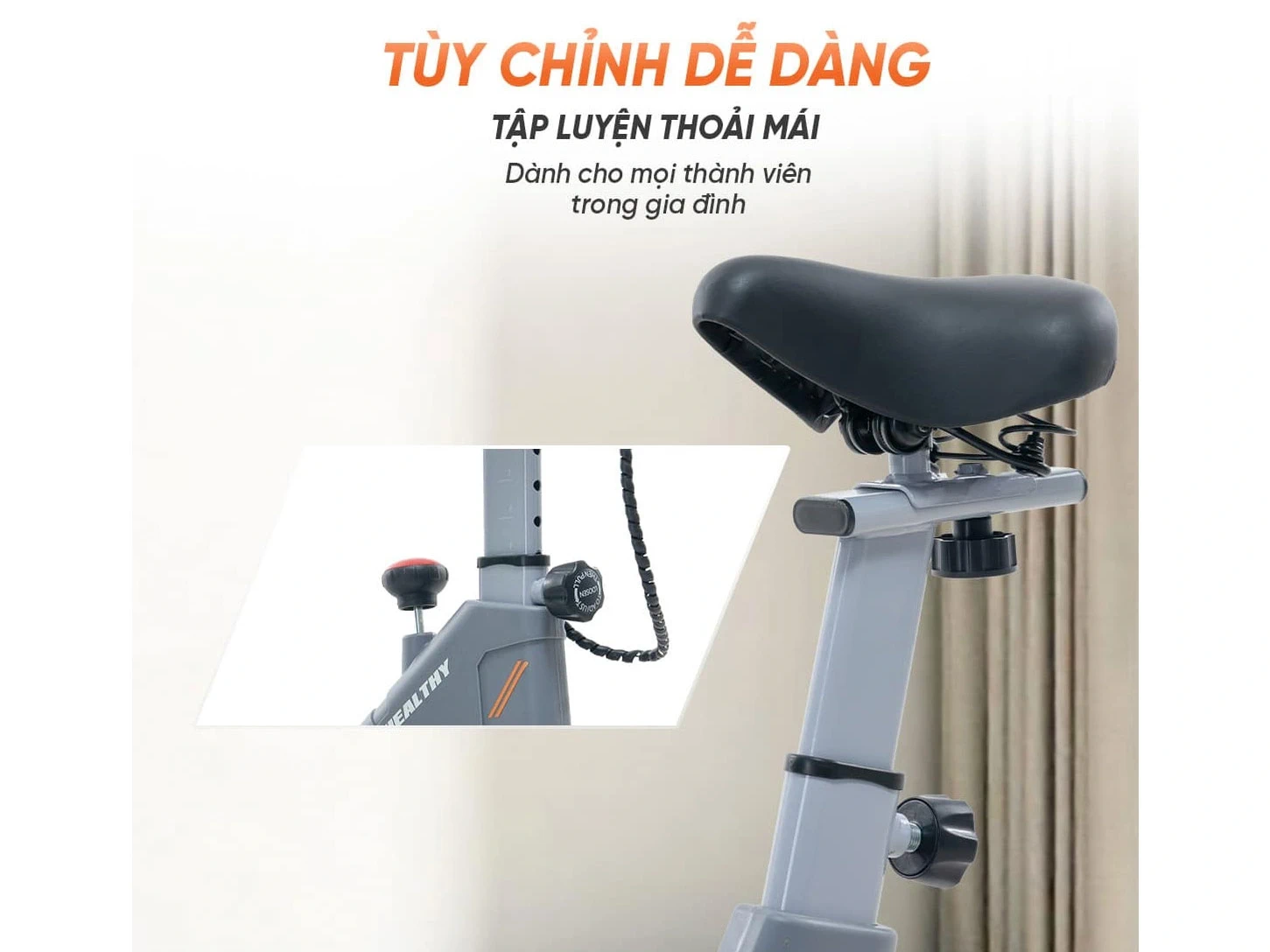 Ghi đông và yên xe có thể điều chỉnh linh hoạt (cao – thấp, gần – xa), giúp người dùng tìm được tư thế tập luyện thoải mái nhất.